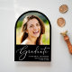 Faire-part de diplôme en forme d'arc noir avec la photo de la grade, "Graduate" dans un élégant script blanc, et leur nom, année de classe et école ou université dans une typographie blanche simple et moderne.