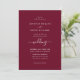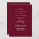 Elégante invitation de mariage bordeaux avec un script moderne. Personnalisez facilement en ligne. Objets correspondants disponibles pour compléter ce faire-part de mariage moderne.