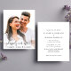 Faire-part de mariage moderne et économique avec une élégante typographie sur le devant et votre photo recouverte de "joyeusement toujours après" dans un script chic avec des swashes et vos prénoms et votre date de mariage rejoint avec un coeur sur le dos.