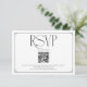 This elegant RSVP card features a sophisticated black and white design, perfect for any modern wedding. The prominent 'RSVP' in a classic script font is complemented by a clear QR code, making it easy for guests to access your wedding website and respond. Below the QR code, you'll find a dedicated space for your wedding website URL and a heartfelt closing message. It's a chic and efficient way to gather your RSVPs while adding a touch of class to your wedding stationery. This design ensures a seamless RSVP process for your guests.