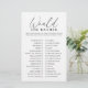 Ce script élégant de jeu de Fête des mariées de Will She Plutôt dispose d'une police de script chic en noir et blanc classique pour un look épuré et minimaliste. Ce jeu de douche nuptiale est parfait pour faire fidéliser et exciter les invités à propos du prochain mariage de la mariée d'une manière légère. Les questions "Voudriez-vous qu'elle préfère" sont amusantes, décalées et donnent un aperçu des goûts, des intérêts et des préférences de la mariée. Alors que les invités débattent de ce que la mariée choisirait, des rires et de nouvelles conversations coule à flots ! L'élégant script Will She Plutôt Game fera de votre douche nuptiale se sentir sophistiqué et spécial. Commandez dès aujourd'hui ce jeu de douche nuptiale incontournable pour surprendre la mariée et ravir les invités !