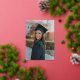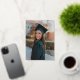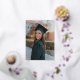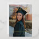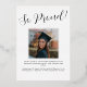 Un élégant Script simple 2 Photo Gold Foil carte de faire-part de graduation avec police de script, photo de portrait saigné plein sur le devant avec le nom, l'école, et la classe de l'année. Le dos a "So Proud!" avec le texte de faire-part personnalisable et une deuxième photo encadrée d'une fine ligne noire.