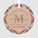 L'élégante décoration rustique de l'ornement de vacances comprend un cadre à motif en plaid de couleur beige, tan, rouge et marron avec votre photo préférée sur le devant et un monogramme personnalisé de la famille Joyeux Noël qui peut être personnalisé sur le dos.