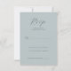 This elegant wedding RSVP card features a minimalist design with a soft, muted teal background that creates a serene and sophisticated atmosphere. The layout is clean and uncluttered, with ample negative space around each element, ensuring clarity and focus on the essential details. A mix of cursive and serif fonts adds an inviting yet formal touch, while customizable fields allow for personalization. Perfect for couples seeking a simple yet stylish way to manage their guest list, this card conveys a mood of calm elegance ideal for any wedding celebration.