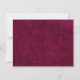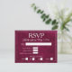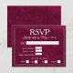 Cette élégante carte de réponse comporte un fond bordeaux profond avec une texture de faux velours doux et un cadre à double bordure raffiné. Un lettrage serif classique associé à une écriture élégante ajoute une touche intemporelle, tandis que la mise en page épurée comprend des options de réponse, des sélections de repas et une ligne pour les noms des invités. Parfaite pour les mariages formels, les célébrations en soirée et les suites d'événements sophistiqués, cette carte de réponse se coordonne parfaitement avec des modèles d'invitation luxueux aux tons de bijoux.