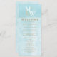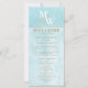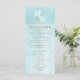 Élégant programme de mariage Monogramme Turquoise en verre de mer. Bel aménagement côtier idéal pour les mariages à thème de plage. Design arrière - plan en verre de mer effet effet en verre de mer turquoise dépoli, avec des initiales monogrammes en haut en blanc avec l'ampersand d'or décoratif, le texte du programme de mariage montré en texte de couleur or sur la couleur de verre de mer dépoli pâle. Le dos a un texte de fête de mariage en or sur le verre de mer gelé pâle. Personnalisez avec vos initiales en monogramme de mariée et de mariée, noms de mariée et de mariée, date du mariage, emplacement du mariage, bref message de remerciement, le texte de la cérémonie, la fête de mariage. Nous vous invitations à visiter notre magasin Zazzle, Beachy Design Co, pour voir les produits correspondants et plus encore. Veuillez nous contacter si vous avez besoin d'aide.