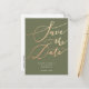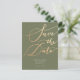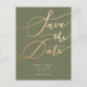Élégante et moderne carte de faire-part modèle carte postale avec un texte calligraphié à la main qui dit "Sauver la Date" en or faux sur un fond vert olive. Au verso de la carte, vous pouvez ajouter un bref message sur votre relation et combien vous êtes excité pour la célébration. Ce design typographique est simple mais élégant !