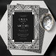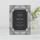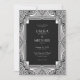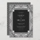 Ces élégantes invitations de mariage vintage à plat de 5" x 7" présentent un design orné en blanc sur un arrière - plan noir à la texture motif caché entre les deux. Le dos a le même motif muet. Les espaces réservés comprennent une introduction, le prénom et le nom du couple mariage, la date, l'heure, le lieu, l'adresse du lieu et l'information sur la réception.