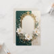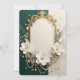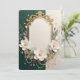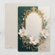Create timeless elegance with this stunning customizable design featuring a sophisticated ornate gold frame adorned with delicate white magnolia flowers, dainty baby's breath, and cascading pearl strands. The rich emerald green and soft cream background creates a perfect luxurious contrast.