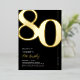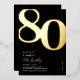 Véritable feuille noir et or 80e anniversaire invitations de fête avec le numéro '80' dans une grande police serif audacieuse, et un modèle invitation moderne qui est facile à personnaliser.