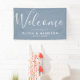 Élégant Script Dusty Blue Mariage Affiche de bienvenue bannière. Bienvenue à votre famille et à vos amis avec ce simple modèle de signalisation mariage. Personnalisez ce panneau mariage élégant et élégant avec les noms et la date.
