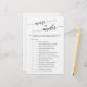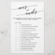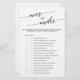 Cette élégante calligraphie noire sur ou sous le jeu est parfaite pour une simple douche nuptiale. Le design neutre présente une carte de jeu minimaliste décorée avec une typographie romantique et fantaisiste. Personnalisez le jeu avec vos propres déclarations !