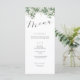 Ce design minimaliste élégant à la carte de mariage présente une floraison de verdure et de fleurs blanches, complétée par une typographie calligraphique classique. Un menu mariage classique pour habiller vos tables de manière harmonieuse et s'adapter à votre thème mariage tout au long de vos idées de décoration mariage.