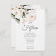 Des roses blanches délicates en haut à gauche de cette carte d'attribution élégante. Typographie grise personnalisable pour le nom ou le numéro de table, et pour la liste des invités.