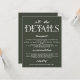 Partagez toutes les informations importantes pour votre grande journée en style avec cette carte élégante de détails de mariage. Avec une typographie moderne sur un arrière - plan minimaliste, cette carte est conçue pour compléter n'importe quelle suite mariage. Parfait pour fournir à vos invités les détails de transport, l'hébergement et les informations d'immatriculation, il assure à chacun tout ce dont ils ont besoin pour votre célébration. Un ajout réfléchi et pratique qui ajoute à la fois beauté et clarté à votre papeterie mariage.