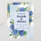 Elégant faire-part de mariage à thème bleu royal avec élégant bouquet de bleu royal, Navy, bourgeons de fleurs roses de couleur jaune et des feuilles d'eucalyptus.