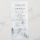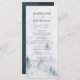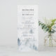 Elégante carte de menu de mariage personnalisée avec une forêt de pins gris et brumeux bleu aquarelle en haut avec votre nom, date mariage, et les détails du menu ci-dessous. Le menu revient à un arrière - plan bleu marine d'aquarelle avec espace pour le texte et les photos. Conçu pour coordonner avec notre collection Elegant Winter Forest mariage.