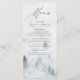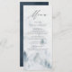 Elégante carte de menu de mariage personnalisée avec les détails de votre menu en haut du menu avec une forêt de pins gris & brumeux bleu aquarelle en bas. Le menu revient à un arrière - plan bleu marine d'aquarelle avec espace pour le texte et les photos. Conçu pour coordonner avec notre collection Elegant Winter Forest mariage.