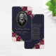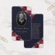 Carte de mémoire florale bleue/carte de prière funéraire avec une photo ornée de roses rouges rousses et bordeaux et de fleurs d'haleine de bébé sur un arrière - plan bleu foncé.
