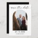 Carte élégante de sauvegarde de date avec un cadre photo d'arche moderne mettant en vedette un couple élégant debout entre des formations rocheuses. Typographie minimaliste et mise en page épurée.