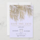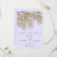 Thème de mariage tendance et tropical sur feuille de palmier avec palmier moderne simple en faux or et typographie simple lavande, une carte de sauvegarde de date élégante