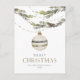 Cette élégante carte de Noël présente un design minimaliste avec un unique ornement argenté accroché sous la verdure. Les branches délicates et les tons feutrés lui confèrent une atmosphère sophistiquée et festive. "Joyeux Noël" est imprimé en lettres élégantes, créant un accueil chaleureux et accueillant.