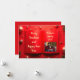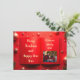 Design élégant de carte photo de Noël avec un arrière - plan rouge vif avec des ornements dorés, des branches de pin festives et un cadre photo centré sur un plan de style livre ouvert. Personnalisable avec votre nom de famille et votre année, cette carte de voeux de vacances est parfaite pour envoyer des voeux de Noël joyeux à des amis et à des proches. Un magnifique mélange de minimalisme moderne et de charme de Noël intemporel.