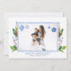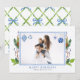 Cette belle carte de photo de vacances comporte un cadre aquarelle bleu pour une photo. Le cadre est fait de ruban aquarelle bleu avec des ornements de Noël de style chinoiserie et de la verdure autour du cadre avec des baies de Noël. Le verso de la carte comporte de la verdure avec un ruban français bleu.