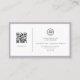 Elégante carte de code QR Social Lavender Carte de visite ATTENTION : Ce modèle comporte des petites lettres. Si vous préférez les lettres plus grandes, veuillez choisir un autre modèle. Carte de visite de code QR élégant et moderne dans le cordon de sable. Ce carte de visite est un carte de visite de logo et aussi une carte de code QR. Notre modèle de carte de visite de code QR est un modèle de carte de visite conçu par un professionnel qui fera évoluer votre marque d'entreprise en un rien de temps. Avec l'option d'insérer votre code QR, votre logo et vos réseaux sociaux. Ce modèle modifiable est un modèle qui présente les dernières tendances en matière de design.