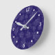 Elégante horloge ronde florale moderne avec arrière - plan bleu classique et feuilles abstraits illustrés en blanc.
