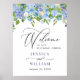 Bienvenue invités à votre mariage avec Blue Hydrangea Floral Greenery REHEARSAL DÎNER Bienvenue Poster, avec une verdure botanique d'aquarelle luxuriante et des fleurs blanches, avec "bienvenue à notre heureux toujours après", vos noms, et mariage date dans un mélange chic de bloc moderne et de caractères calligraphie lettré à la main.