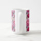 Roses rouges, pivoines roses et lilas violets sur un arrière - plan blanc créent une belle tasse à l'allure vintage. Un badge rond avec la bordure et centre en couleurs complémentaires a de l'espace pour votre nom et monogramme.