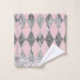 Sur cet ensemble de serviettes design se trouve une arlequine argentée ombragée sur une toile de fond rose sombre où au fond des serviettes se trouve une bordure en parties scintillant argentée pour plus de glamour. Thème Girly chic