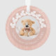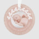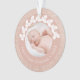 Un ornement de Noël moderne et personnalisé qui présente une belle couronne blanche et une texture de parties scintillant d'or rose en faux cuivre. Personnalisez le produit avec le nom, l'année et deux de vos photos préférées.