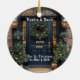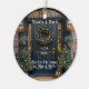 Décor spécial de Noël avec l'image d'une porte d'entrée bleu marine, avec la fenêtre de la salle, une jolie couronne de Noël en or et vert. De beaux arbres de Noël de Noël de chaque côté de la porte, avec de jolies lampes de porche brillantes. Ajoutez votre texte pour personnaliser ce magnifique ornement.