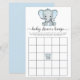 Joli jeu de douche de bingo garçon avec "baby shower bingo" dans un script gris doux et élégant avec des swashes et une aquarelle bleu pastel d'un bébé éléphant garçon