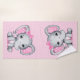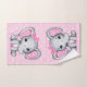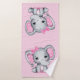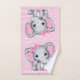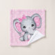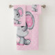 Serviette avec une jolie illustration d'aquarelle d'éléphant rose. Elle a de jolies oreilles de pois roses et blancs et un joli ruban rose au-dessus de sa tête. L'Arrière - plan est rose clair avec des pois crème.