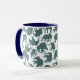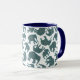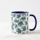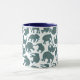 Un amusant Ringer Coffee Mug, avec des silhouettes d'éléphant, rempli d'un bleu foncé et d'un motif de Paisley bordeaux, sur un arrière - plan blanc que vous pouvez changer si vous le souhaitez. Une partie de la collection Posh & Painterly 'Heffalumps'.