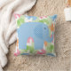 Les éléphants sur le coussin Parade avec un gros éléphant bleu et de nombreux petits éléphants de bleu, orange, vert et rose.