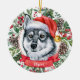 Cet ornement sophistiqué de Noël en céramique Elkhound norvégienne présente une aquarelle d'un joli portrait d'elkhound dans un chapeau de Père Noël, entouré de verdure de vacances, de pinecones et de baies, avec une bannière rouge avec le nom de votre animal (ou changer pour Joyeux Noël). Vous pouvez entièrement personnaliser ce design en changeant le salut et l'année sur le dos dans une police élégante. C'est un ornement de Noël élégant et personnalisé, parfait pour les fans norvégiens d'Elkhound, les amateurs d'elkhound, les amoureux de les chiens et les amoureux des animaux de compagnie.