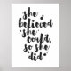 Affiche inspirante montrant l'expression "Elle croyait qu'elle le pouvait, alors elle l'a fait" dans un script en brosse noire avec une texture d'encre organique pour obtenir un look authentique, lettré à la main. Conçu pour être parfait sur toutes les tailles d'affiche orientées portrait. Vérifiez si l'image doit être repositionnée ou redimensionnée après avoir modifié la taille de l'affiche.