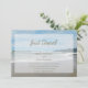 Cette invitation à la faire-part de mariage mariage d'elopement présente une belle scène photographique de plage avec des vagues arrivant sur la plage. Les mots "Just Eloped" apparaissent en haut du design dans les nuages. Les noms du couple nouvellement marié apparaissent dans l'eau et les détails de l'élévation sont écrits dans le sable. À l'arrière du faire-part, vous pouvez customiser le design avec votre adresse. Une belle faire-part d'étage pour un mariage tropical ou de plage. Copyright henishouseo