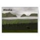 Un tableau numérique de conifères verts et de montagnes en Alaska par jour très gris et nuageux. Un orignal au premier plan prête de l'échelle à la scène. Le texte "Alaska" apparaît également.