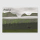 Un tableau "primitif" ou folklorique de conifères verts et de montagnes sur une journée très grise avec des nuages suspendus bas. Un orignal (Alces alces) au premier plan donne de l'échelle à la scène. Lecture de texte personnalisable, "Alaska" apparaît également.
