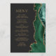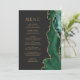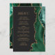 Le bord droit de cet élégant menu mariage moderne est orné d'une bordure en aquarelle vert émeraude et d'une parties scintillant en faux or. Le texte personnalisable combine des polices serif et cuivre couleur or sur un arrière - plan non noir. L'envers est assorti d'un design d'agate vert et or.