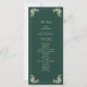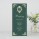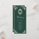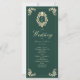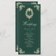 Elégante carte de programme de mariage en vert émeraude avec ornement or baroque fleurit et un luxueux monogramme victorien. Ce programme recto verso offre de l'espace pour l'ordre de cérémonie, les sélections musicales, les lectures et la liste des mariages. Un design intemporel qui s'accorde parfaitement avec une suite vert émeraude et une suite de faire-part de mariage dorées, idéal pour les couples qui planifient une célébration sophistiquée et formelle.