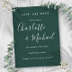 Doté de noms de style signature, cet élégant vert émeraude enregistrer la carte de date peut être personnalisé avec vos informations spéciales d'événement en lettrage blanc chic. Conçu par Thisisnotme©