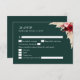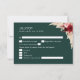 Voici notre carte RSVP de mariage Emerald Green Tropical, un mélange parfait de vert émeraude et de l'allure captivante des roses tropicaux. Elevez vos préparations mariages avec ce morceau méticuleusement travaillé, conçu pour encapsuler l'essence de votre journée spéciale. Cette carte RSVP permet non seulement de saisir avec élégance les réponses de vos invités, mais aussi d'apporter une touche de sophistication à votre papeterie mariage. L'avant de la carte présente une combinaison harmonieuse de vert émeraude luxuriant et de la délicate beauté des roses tropicaux. Avec des sections dédiées aux préférences de menu et aux exigences alimentaires, il assure le confort de chaque client est pris en charge. L'interaction des couleurs et des ornements floraux s'cravate sans heurts dans le thème général de votre collection de Roses tropicaux Emerald Green, créant une expérience unifiée et enchanteresse. Au contraire, découvrez l'adresse du couple élégamment affichée. Cette touche attentionnée ajoute un élément personnel et pratique, permettant à vos invités de répondre facilement. Offrez-vous le luxe du vert émeraude, la beauté intemporelle des roses, et la commodité des RSVP organisés avec notre carte RSVP de mariage Roses Emerald Green Tropical. Laissez chaque carte symboliser l'anticipation et la joie entourant votre union. Bienvenue à vos invités pour participer à ce voyage magique.