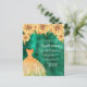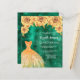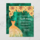 Une invitation moderne, élégante et glamour pour une Quinceañera, 15ème anniversaire. Un arrière - plan vert émeraude clouté avec un faux or une robe et des roses, des fleurs. Le nom est écrit avec un script de style moderne écrit à la main. Personnalisez et ajoutez les détails de votre fête. 1 feuille = 1 invite imprimé bord à bord.