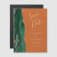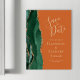 Cette élégante carte magnétique moderne de save the date présente une bordure d'agate aquarelle vert émeraude ornée de paillettes de faux or. Personnalisez facilement le texte doré sur un fond orange brûlé ou rouille.
